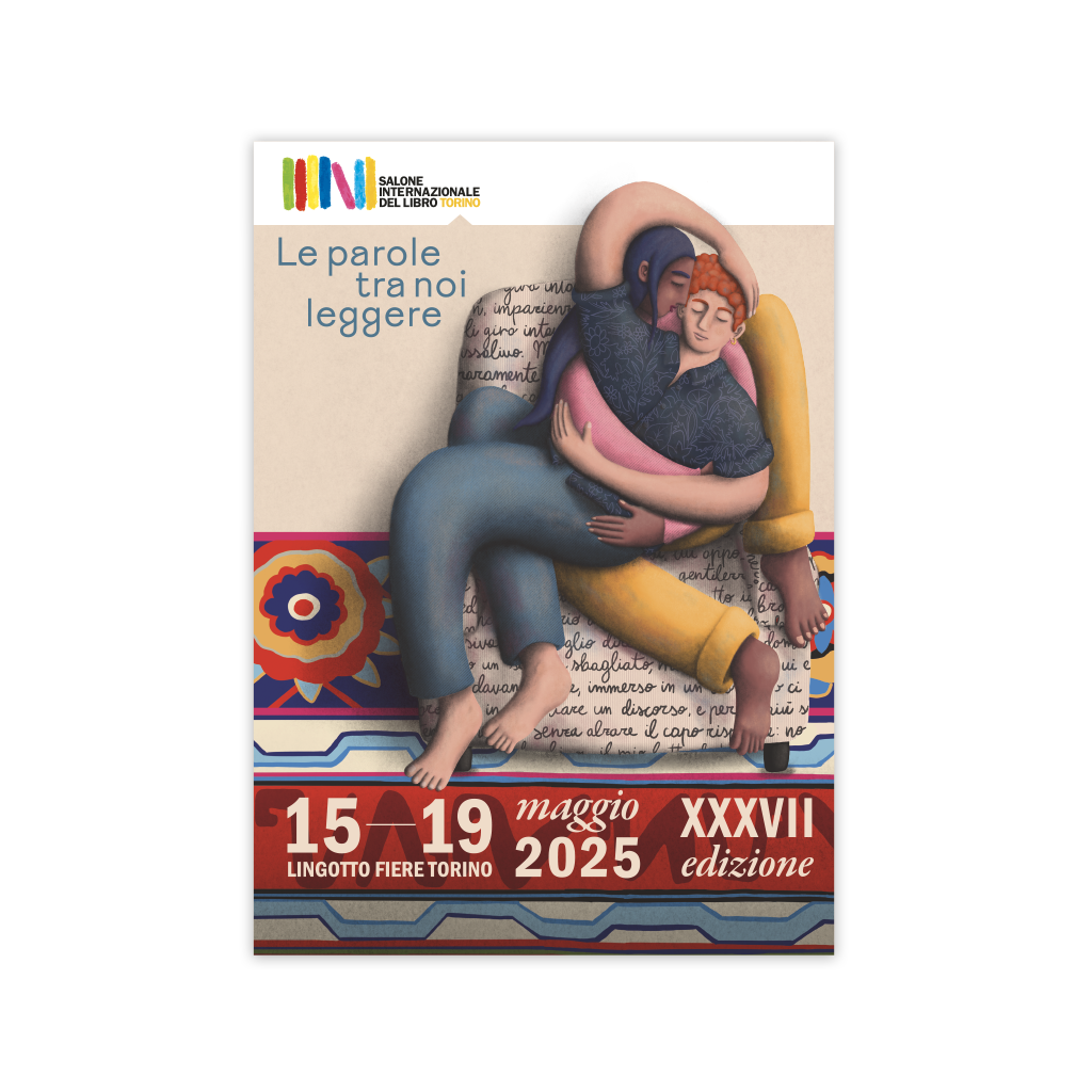 La locandina ufficiale del Salone del Libro 2025, con l'illustrazione di Benedetta Fasson: un caldo abbraccio in primo piano ci racconta che le parole, leggere e precise, creano connessione e intimità.
